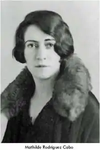 Matilde Rodríguez Cabo Guzmán (Las Palmas, San Luis Potosí, July 17, 1902 – Mexico City, September 8, 1967,) was Mexico's first female psychiatrist.[1] Also a surgeon, writer, feminist, and suffragist, Rodríguez was an activist for the right of Mexican women, and affiliated with the Mexican Communist Party. She was married to General Francisco J. Múgica; they had a son, Janitzio Múgica Rodríguez Cabo.[2]