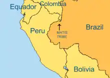 The Matis people (also called Matsë in their own native language) are an indigenous people of Brazil.[1] The Matis are commonly named as the Jaguar people by tourists and filmmakers, but they do not like to be called like this. They live in three separate communities with total population of roughly 340. They live in the far west of Brazil, in the Vale do Javari Indigenous Territory, an area covering 83,000 square kilometres (32,000 sq mi). They practice hunting, fishing, collecting (also called foraging) and agriculture. Now, they also receive money from their work as teacher, health assistance, surveillance of the territory when working for FUNAI, for example, and the elders receive pension from the government (inscribed as retired farmers, as other traditional communities also have the right for in Brazil).