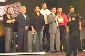 On the edition of August 12 of Impact! Morgan joined Ric Flair's Fortune (originally spelled Fourtune) stable, as he, A.J. Styles, Kazarian, Robert Roode, James Storm and Douglas Williams attacked EV 2.0, a stable consisting of former Extreme Championship Wrestling performers.[66] At Bound for Glory Morgan, Styles, Kazarian, Roode and Storm were defeated in a Lethal Lockdown match by EV 2.0 members Tommy Dreamer, Raven, Rhino, Sabu and Stevie Richards.[67] On the following edition of Impact! Fortune formed an alliance with Hulk Hogan's and Eric Bischoff's new stable, Immortal.[68] However, Morgan would be kicked out of Fortune after he faced Jeff Hardy for the TNA World Heavyweight Championship, turning him into a fan favorite.[69] He would have two titles matches at Turning Point and Final Resolution, but he lost both times.[70][71][72]