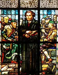 ![]() "Luther et la Diète de Worms en 1521" with Matthew 10:32 in German, on the window of Église protestante de Notre Seigneur Jésus-Christ de Bischheim, Alsace, Bas-Rhin. Joseph Ehrismann (1880-1937). | |