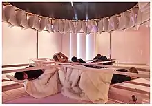 Sarcophagus (2016), exhibited at the 15th Venice Architecture Biennale invited audiences to experience an immersive environment of simulated sleep-states. This multidimensional architectural installation renders creative curiosities of biological and induced respite, challenging a range of aesthetic, cultural and behavioural concerns. Users are invited to physically occupy the installation offering an unusual interactive experience. The environment is dynamic with the interior transforming with the aid of a multichannel film, filling the intimate chamber with abstract cinematic and meditative sound and imagery.[9]