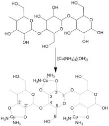 Schweizer's reagent is an alkaline solution of copper sulfate in ammonia, [Cu(NH3)4] (OH)2–3H2O, or CuH14N4O2.[4][5] Schweizer's reagent may be prepared by covering technical grade, stabilized Copper(II) hydroxide with ammonium hydroxide.[6] It was the basis for the process patented in 1890 by the French chemist Louis-Henri Despeissis for making fibers from cuprammonium rayon.[3] He extruded the cuprammonium solution of cellulose into water, then used dilute sulfuric acid to neutralize the ammonia and precipitate the cellulose fibers.[7] Despeissis died in 1892 and his patent was not renewed.[8]