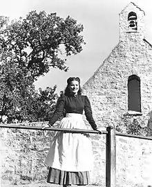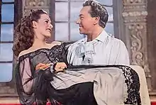 In 1945, O'Hara starred opposite Paul Henreid in The Spanish Main as feisty noblewoman Contessa Francesca, the daughter of a Mexican viceroy.[84] O'Hara described it as "one of my more decorative roles",[85] as her character is a particularly aggressive one among the men on a ship, and during the course of the film her face is smothered in chimney soot.[86] O'Hara almost did not win the role when another actress falsely told RKO executive Joe Nolan that she was "as big as a horse" after giving birth to a daughter in 1944.[87] Around this time "an actress named Kathryn" also falsely accused O'Hara of making sexual advances towards her in an elevator, which she believed was a way for the actress to gain attention at the start of her career.[88] During the production of The Spanish Main, O'Hara was visited by John Ford, who was initially turned away for being shabbily dressed, but was later admitted to informing her about the project that would become The Quiet Man (1952). Malone notes that in the film O'Hara "shows her determination not to leave her sexuality at the birthing stool", commenting that she looks "deliciously fragrant in the splashy histrionics on view here, in RKO's first film in the three-color Technicolor process" [87] O'Hara became a naturalized citizen of the United States on 24 January 1946,[6] and held dual citizenship with the United States and her native Ireland.[89]