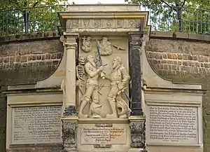 Albert Alcibiades was a former ally of Maurice, who had fought in the Schmalkaldic War on his side. But now Maurice, involved in an alliance of princes, with Ferdinand I amongst others, was compelled to fight against Albert Alcibiades. On 9 July 1553 the Battle of Sievershausen took place at Lehrte. Maurice won this battle, but was badly wounded in the stomach by a shot from the rear and succumbed two days later in the field camp at the age of 32. He was buried in Freiberg Cathedral. In 1853, 300 years after the battle, the place of his death was commemorated by a monument erected to his memory. The 7.5 ton heavy granite monument came from his native Saxony.