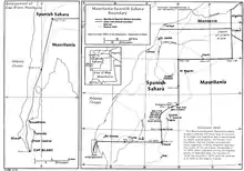 From 1946 to 1958 Spanish Morocco, the Tarfaya Strip, Ifni, Rio de Oro and Saguia el Hamra were united as Spanish West Africa. Morocco gained independence from France in 1956, including Spanish Morocco (minus the plazas de soberanía which remain part of Spain today). The newly independent state, inspired by the idea of creating a 'Greater Morocco', claimed all of Spanish West Africa as Moroccan land.[4] In 1958 Spain merged Rio de Oro and Saguia el-Hamara in 1958 as Spanish Sahara;[2] that same year Spain ceded the Tarfaya Strip to Morocco (via the Treaty of Angra de Cintra).[3][2][5] Ifni was ceded in 1969 (following a failed Moroccan attempt to capture the region by force in 1957).[2][6] Morocco then turned its sights to Spanish Sahara, however Mauritania (independent since 1960) also contested the territory, claiming the former colony of Rio de Oro as part of 'Greater Mauritania'.[2] A railway was built in 1960-63 which paralleled the southern half of the boundary, including an expensive tunnel through an escapement north-west of Choum constructed so as to order to avoid the right-angle of the south-eastern Spanish Sahara. Saharawi nationalists had meanwhile formed the Polisario, seeking independence for the whole of Spanish Sahara as Western Sahara, and began a low-level guerrilla campaign. An International Court of Justice ruling on the matter in October 1975 stated that neither the Moroccan nor Mauritanian claims to Western Sahara were strong enough to justify annexation, and that the Saharawi people should be allowed to determine their own future.[7][2] Morocco thereafter sought to settle the matter military, and in November 1975 conducted the 'Green March', in which thousands of soldiers and Moroccan nationalists forcibly crossed the Morocco-Spanish Sahara border. Spain's dictator Francisco Franco was at this time near-death, and the country was unwilling to respond militarily at such a delicate time, keen to avoid the kind of drawn-out colonial war that had bedevilled Portugal in its African colonies. Spain therefore signed a treaty with Morocco and Mauritania, splitting Spanish Sahara roughly in two, roughly two-thirds in Morocco's favour.[2] By this treaty only the northern third of the traditional Mauritania–Western Sahara border remained extant. Polisario forces declared a Sahrawi Arab Democratic Republic based on the boundaries of Spanish Sahara, thus starting a long war against Morocco and Mauritania. Unwilling to continue the conflict, Mauritania pulled out of their zone in 1979, which was then annexed by Morocco, thereby reinstating the former Mauritania-Western Sahara frontier.