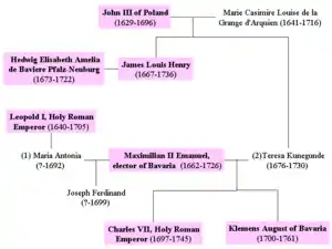 - Charles Albert (1697–1745), elector of Bavaria, King of Bohemia and Holy Roman Emperor, ∞ 1722 Maria Amalia Josepha Anna of Austria (1701–1756)