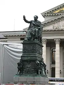 The city of Munich was extended by the first systematic expansion with the new Brienner Strasse as core. In 1810 Max Joseph ordered construction of the National Theatre Munich in French neo-classic style. The monument Max-Joseph Denkmal before the National Theatre was created in the middle of the square Max-Joseph-Platz as a memorial for King Maximilian Joseph by Christian Daniel Rauch and carried out by Johann Baptist Stiglmaier. It was only revealed in 1835 since the king had rejected to be eternalized in sitting position.