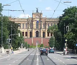 After crossing the river Isar further east, the avenue circles the palatial Maximilianeum (Friedrich Bürklein, 1857–1874), home of a gifted students´ foundation and the Bavarian Landtag (state parliament). Due to statical problems at the bank of river Isar the construction was only completed ten years after the King's death and the facade of the building which was originally planned also in neo-Gothic style had to be altered in neo-Renaissance. The Maximiliansbridge with the statue of Pallas Athene was built in the years 1857-1863 as an extension of Maximilianstraße to the Maximilianeum, and broadened in 1903.