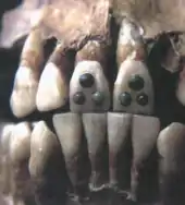 Most likely teeth were modified as a part of ritual or for aesthetic purposes, and younger children usually did not have modified teeth.[13] Once their permanent teeth had arrived, adolescent warriors had their teeth filed to sharp points to give them a fierce appearance, and as a further mark of status.[4] Maya women filed their teeth, or had holes drilled into them where precious stones or luxury materials, such as jade, pyrite, hematite, or turquoise could be inlaid into the teeth.[12] High-status women often had their teeth filed, in different patterns, and would have jadeite, hematite, pyrite, turquoise, or other decorations inset into holes drilled in their teeth.[4] Depending on the material, the meaning of the inlay varied. For example, jade symbolized pure breath or the ability to express elegant speech.[12]