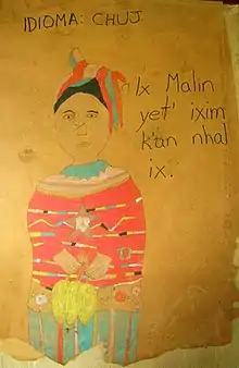 Qʼanjobʼal is spoken by 77,700 in Guatemala's Huehuetenango department,[32] with small populations elsewhere. The region of Qʼanjobalan speakers in Guatemala, due to genocidal policies during the Civil War and its close proximity to the Mexican border, was the source of a number of refugees. Thus there are now small Qʼanjobʼal, Jakaltek, and Akatek populations in various locations in Mexico, the United States (such as Tuscarawas County, Ohio[33] and Los Angeles, California[34]), and, through postwar resettlement, other parts of Guatemala.[35] Jakaltek (also known as Poptiʼ[36]) is spoken by almost 100,000 in several municipalities[37] of Huehuetenango. Another member of this branch is Akatek, with over 50,000 speakers in San Miguel Acatán and San Rafael La Independencia.[38]