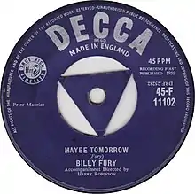 "Maybe Tomorrow'" is a song by English rock and roll singer Billy Fury, released as his debut single in January 1959. It peaked at number 18 on the UK Singles Chart.[2]