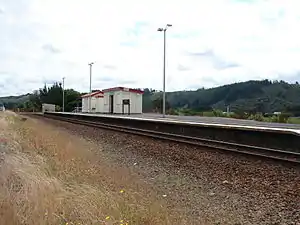 Nothing remains of the crossing loop, and all sidings have also been lifted.[5] Despite this, there is still evidence of the former presence of the loop including the second platform, the gap between it and the main line, and the extra-wide Maymorn Road overpass. There is a passenger shelter on the main line platform (the shelter on the second platform has long been removed), a couple of equipment buildings, and a shed for a surfaceman's trolley.[6] On 14 November 2009 the Rimutaka Incline Railway excavated the back of the second (disused) platform to both retrieve fill and to make way for the formation of their own rail yard.[7]