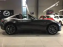 In late 2016, a new MX-5 RF (Retractable Fastback) model was announced. It features a rigid roof and buttresses that give the silhouette a more coupé-like appearance than the soft top convertible. The top panel of the roof folds back while the buttresses remain in place, similar to a Targa top. Antecedents for the flying buttresses design are found in the Chevrolet Corvette (C3) T-top coupé and the Ferrari Dino 206 GT and 246 GT. The interior of the MX-5 RF model is almost the same as the soft top, with the same media screen, seats, steering wheel and switchgear, and the trunk volume is the same as the soft top. Differences include a full circle colored digital gauge in place of the soft top's semi-rectangular, half-digital, mono-colored display. The storage cubby behind the drivers seat has been eliminated, and the cubby behind the passenger seat as well as the glove box behind the center console have been made shallower to make room for the roof mechanism. The MX-5 RF uses the same engines as the soft top model and offers similar performance. The MX-5 RF also introduced a new 'Machine Grey Mica' paint.[15] [16]