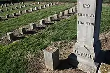 Soldiers from every Southern state in the Confederacy, except Virginia, are represented in the cemetery. Wooden headboards with the soldier's personal identification were installed. Footboards were added in 1867. The fence was added with the assistance of Georgia author Mary Ann Harris Gay, whose brother had died in the battle. She raised $5,000 to fund the iron fence and gate, which is marked with a plaque bearing her name.[4]