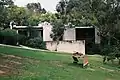 "The Grimwade House was designed by David McGlashan and Neil Everist and constructed in 1961-62 for Geoffrey Holt Grimwade (1902-1961), his wife and their four daughters. It was built as a retirement home that could also serve as a holiday house, on a large block of land at Rye, surrounded by natural bush of melaleucas and casuarinas. It is located on a sandy ridge half kilometre from Port Phillip."[3] "The house, designed on a 10-foot (3.048 m) module, comprises five flat-roofed pavilions, linked by covered ways, which create a variety of sheltered outdoor courtyards between the wings."[3] The main house forms an L-shape, consisting of bedrooms and living area connected by a large north-east facing terrace.