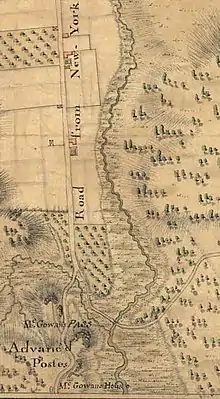 From 1776 until 1783, during the British occupation of New York, McGowan's Pass was a key high-ground position on the route between New York City to the south and Fort Knyphausen (Fort Washington) to the north. For most of this period, the area around the Pass was the site of a Hessian encampment.[6] After the Treaty of Paris, British and Hessians marched through the Pass when evacuating north Manhattan; and George Washington likewise came through the Pass when he reentered New York on Evacuation Day, November 25, 1783.