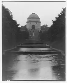 Over sixty designs were submitted, and Harold Van Buren Magonigle of New York City was selected as the winner of the competition. Magonigle envisioned a cross-hilted sword with a mausoleum located at the junction of the blade, guard, and hilt. The Long Water (a five-tiered reflecting pool which was 575 feet long) and main steps would form the handle of the sword. This design combined the cross of a martyr with the sword of a President who had acted as commander-in-chief during wartime.