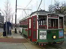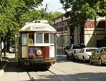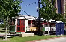 Car 122 was built to a standard American design by the J. G. Brill Company of Philadelphia in 1909[2] for export to Porto, Portugal. Rosie is similar to early streetcars that once operated in Dallas. 122 was retired from service on the Porto streetcar system in 1978,[18] and was brought to the U.S. in the early 1980s by Gales Creek Enterprises (GCE), of Oregon, purchased by Portland businessmen Bill and Sam Naito for possible use on a then-proposed heritage streetcar line in Portland. GCE refurbished it at the Oregon Electric Railway Museum for use, on loan, in the first San Francisco Historic Trolley Festival, in summer 1983, and car 122 operated intermittently in service on San Francisco's Market Street in that year; it was painted yellow-and-cream,[19] the colors of its sponsor in the Trolley Festival, Eastman Kodak.[20] In fall 1984, No. 122 was sold to MATA, and it arrived in Dallas around the beginning of 1985. Having previously been refurbished for use in San Francisco, 122 only needed minor work to bring it into service on MATA's opening day. However, in the late 1990s car 122 received a more extensive restoration. Shortly afterward, 122 developed motor problems which kept it in the barn. These problems have been solved and 122 is currently the oldest streetcar in daily service in North America.[21]