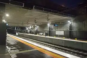 The down platform (Platform 3) at the former ground level station was provided during 1976.[4] A decade later, on 28 June 1987, the Up face of the former island platform was brought into use.[5]