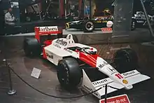 For the 1988 season, six MP4/4 cars were moulded from carbon fibre with assistance from Hercules Aerospace. The chassis numbers, 1 through 6, were used throughout the year. All six MP4/4 chassis still exist: Chassis #1, 3, 4, & 6 are owned by the McLaren Group, with #1 on display at the McLaren Technology Centre and was driven at Goodwood in 2013 by Sergio Pérez.[10] Chassis #3 was previously on loan and displayed at the Donington Grand Prix Exhibition, but was relocated and displayed at McLaren Osaka Hakko.[11] It was relocated again to Museo y Circuito Fernando Alonso in Asturias, Spain by 2016.[12] McLaren Auckland previously had chassis #4 on display for a number of years, but returned to the factory in Woking. Another, chassis #6, was on display at the National Motor Museum in Beaulieu (UK) under Prost livery.[13] Chassis #6 was driven by Bruno Senna at Goodwood in 2009 under the Senna livery.[14] Chassis #2 is owned by a private collector in Chicago, Illinois and has been on display at McLaren of Chicago after being driven by Bruno Senna at Interlagos in 2019.[15][16] Chassis #5 is owned by Honda and is sometimes on display at the Honda Collection Hall at Motegi and ran at Goodwood in 2014 under Marlboro livery by Takuya Izawa.[17][18][19] Additionally, Honda own a showcar, chassis MP4/4/SSC/10 (SSC for static show car), that is occasionally put on display including the 2015 Tokyo Auto Salon and Honda Collection Hall.[20][21][22]