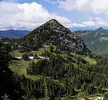 McNeeley Peak is a 6,786 feet (2,068 m) summit located in Mount Rainier National Park in Pierce County of Washington state.[3] It is part of the Sourdough Mountains, a subset of the Cascade Range. McNeeley Peak is situated north of the Sunrise Historic District, east of Mount Fremont, and northwest of Antler Peak. The peak was named in 1932 for Edwin J. McNeeley (born 1858), a prominent Tacoma businessman.[4] Access is limited by snow closing the Sunrise Road much of the year. July, August, and September are typically the months when the Sunrise Road is seasonally open for vehicle traffic. Precipitation runoff from McNeeley Peak drains into the White River.