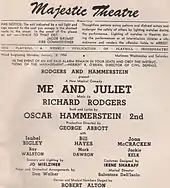 The musical opened on Broadway on May 28, 1953 at the Majestic Theatre.[28] Large advance sales guaranteed a considerable run; by the start of November, it had paid back its advance,[27] and closed after 358 performances, paying a small profit to RCA.[29] Thomas Hischak, in his The Rodgers and Hammerstein Encyclopedia, suggests that business fell off after the advance sales were exhausted "because audiences had come to expect more from a Rodgers and Hammerstein musical".[29] According to Frederick W. Nolan in his book about the duo's works, "despite a $500,000 advance sale, despite a ten-month run (which, for anyone except Rodgers and Hammerstein, would have represented a major success), and despite an eventual profit in excess of $100,000, Me and Juliet has to be classed as a failure".[30]