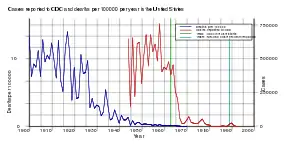 One dose is about 93% effective while two doses of the vaccine are about 97% effective at preventing measles.[5] Before the widespread use of the vaccine, measles was so common that infection was considered "as inevitable as death and taxes."[22] In the United States, reported cases of measles fell from 3 to 4 million with 400 to 500 deaths to tens of thousands per year following introduction of two measles vaccines in 1963 (both an inactivated and a live attenuated vaccine (Edmonston B strain) were licensed for use, see chart at right).[5][23] Increasing uptake of the vaccine following outbreaks in 1971 and 1977 brought this down to thousands of cases per year in the 1980s. An outbreak of almost 30,000 cases in 1990 led to a renewed push for vaccination and the addition of a second vaccine to the recommended schedule. No more than 220 cases were reported in any year from 1997 to 2013, and the disease was believed no longer endemic in the United States.[24][25][26] In 2014, 667 cases were reported.[27]