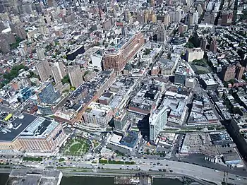 The Meatpacking District is a neighborhood in the New York City borough of Manhattan that runs from West 14th Street south to Gansevoort Street, and from the Hudson River east to Hudson Street.[2][3][4] The Meatpacking Business Improvement District extends these borders farther north to West 17th Street, east to Eighth Avenue, and south to Horatio Street.[5]