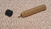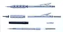 A mechanical pencil, also clutch pencil, is a pencil with a replaceable and mechanically extendable solid pigment core called a "lead" /ˈlɛd/. The lead, often made of graphite, is not bonded to the outer casing, and can be mechanically extended as its point is worn away as it is being used. Other names include microtip pencil, automatic pencil, drafting pencil, technical pencil, click pencil, pump pen, pump pencil, leadholder, pacer (Australian English), propelling pencil (British and Australian English),[1][2] pen pencil (Indian English), and lead pencil (Bangladeshi and American English).