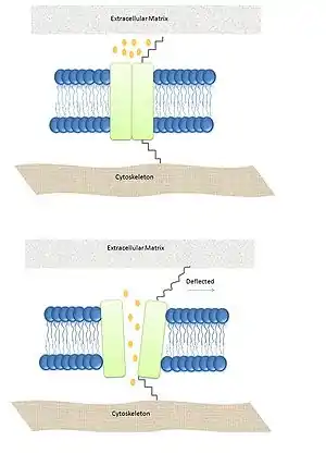 Two different mechanisms have been found to open stretch-activated ion channels: Mechanical deformations in the cell membrane can increase the probability of the channels opening. Proteins of the extracellular matrix and cytoskeleton are tethered to extra - and intra-cytoplasmic domains, respectively, of the stretch-activated ion channels. Tension on these mechanosensory proteins causes these proteins to act as a signaling intermediate, resulting in the opening of the ion channel.[55] All known stretch-activated ion channels in prokaryotic cells have been found to be opened by direct deformation of the lipid bilayer membrane.[57] Channels that have been shown to exclusively use this mechanism of gating are the TREK-1 and TRAAK channels. In studies using mammalian hair cells, the mechanism that pulls on proteins tethered from the intra- and extra-cytoplasmic domain of the channel to the cytoskeleton and extracellular matrix, respectively, is the most likely model for ion channel opening.[57]