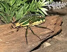 Mecynorhina polyphemus is a large scarab beetle of the subfamily Cetoniinae found in dense tropical African forests, sometimes called the Polyphemus beetle. It is a frequent feeder on fruits and sap flows from tree wounds.