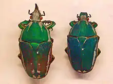 | Mecynorrhina torquata, male and female. Mounted specimen at the National Museum (Prague) | |