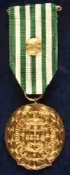 The Medalha de Comportamento Exemplar (Exemplary Behavior Medal), is a Portuguese military medal created on October 2, 1863, by decree of the Secretary of State for the Affairs of War. The medal three grades (gold, silver and copper), and distinguishes military personnel who have served throughout his or her career with exemplary moral and disciplinary conduct and proven spirit of loyalty to the Portuguese Republic.[1]