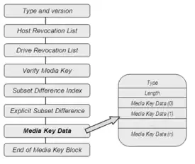 Even though it seems a simple mechanism the MKB key which is found in the physical support of the disc follows a complex structure. The MKB is distributed in blocks that contain the version of the Media key, the list of devices that have been revoked, a field to authenticate the MKB, and other fields that specify parameters corresponding to the decrypting algorithm and define the structure of the own Media Key and also the Media key itself.
