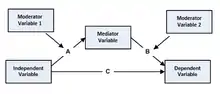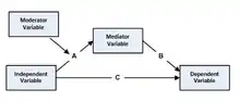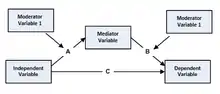 Moderated mediation is when the effect of the treatment A on the mediator and/or the partial effect B on the dependent variable depend in turn on levels of another variable (moderator). Essentially, in moderated mediation, mediation is first established, and then one investigates if the mediation effect that describes the relationship between the independent variable and dependent variable is moderated by different levels of another variable (i.e., a moderator). This definition has been outlined by Muller, Judd, and Yzerbyt (2005)[19] and Preacher, Rucker, and Hayes (2007).[20]