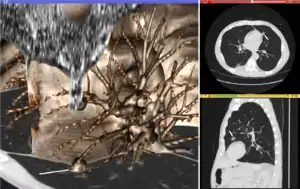The figure "Visualization of Medical Imaging" illustrates several types of visualization: 1. the display of cross-sections as gray scale images; 2. reformatted views of gray scale images (the sagittal view in this example has a different orientation than the original direction of the image acquisition; and 3. A 3D volume rendering of the same data. The nodular lesion is clearly visible in the different presentations and has been annotated with a white line.