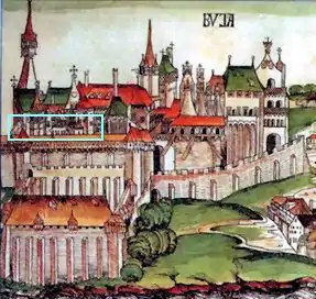 This wing was built by King Sigismund of Luxenburg in the early 15th century but it was rebuilt by King Matthias Corvinus 50 years later. The surviving eastern façade was built from large, finely carved blocks of stone. It followed the contour of Castle Hill with a break in the middle. A huge buttress was added and a rectangular tower with two buttresses on its corners. It was possible to reconstruct the lower part of a balcony on the tower with three elegant Gothic corbels decorated with cusps.