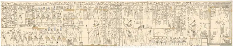 The sparse outline of the scene was published by Vivant Denon in 1802,[1] who was part of Napoleon's expedition to Egypt in 1798 to 1801, which published a slightly more detailed scene in 1809.[2] Thirty years later, the complete scene including the cartouches of the kings was published by John Gardner Wilkinson in 1837,[3] followed by Champollion[4] and Lepsius.[5] All the 19th-century editions contain omissions and errors, but in 1940 the Epigraphic Survey published the definitive (and complete) rendering of the scenes.[6]