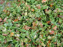 Levantine cuisine is the cooking of the Levant (including the Middle Eastern Mediterranean coast, east of Egypt). Among the most distinctive foods of this cuisine are traditional small meze dishes such as tabbouleh, hummus, and baba ghanoush.[59][60] Tabbouleh is a dish of bulgur cracked wheat with tomatoes, parsley, mint and onion, dressed with olive oil and lemon juice.[61][62] Baba ghanoush, sometimes called "poor man's caviar", is a puree of aubergine with olive oil, often mixed with chopped onion, tomato, cumin, garlic, lemon juice, and parsley. The dish is popular across the whole of the Eastern Mediterranean and North Africa.[63]