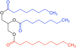 Typical example of a medium-chain triglyceride, containing three medium chain fatty acids (caprylic acid in blue and capric acid in red)