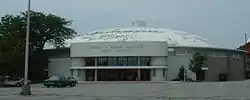 The George V. Meehan Auditorium is a 3,059-seat hockey arena, in Providence, Rhode Island. The arena opened in 1961 and was dedicated on January 6, 1962. It is named for George V. Meehan, the benefactor of the arena, which he hoped would "service and promote" the Brown Bears ice hockey program, which now belongs to the Ivy and ECAC Hockey leagues. It is recognizable for its large white domed roof, and is located on the highest corner (Hope Street and Lloyd Avenue) of Brown's main athletic complex on College Hill in Providence.