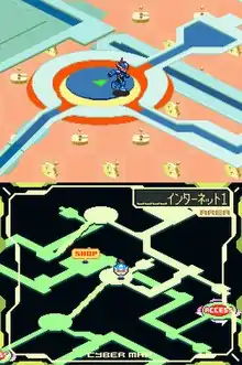 Unlike the previous action-platformer entries of the Mega Man franchise, Mega Man Battle Network is a real-time tactical RPG. To progress through the game the player must alternately navigate the outside world as Lan Hikari and the Net as MegaMan.EXE, each containing certain tasks that must be completed to allow advancement in the other.[12] Controlling Lan, the player may travel around the world map, interact with non-player characters, check email, purchase items, initiate Net missions, or speak with MegaMan.EXE through his PET.[7] In contrast with traditional Mega Man entries in which battle and movement through the levels happen in the same setting, Battle Network's combat occurs only through by battling computer viruses within the Net. This cyber world is represented by a series of branching pathways and nodes, where MegaMan.EXE can travel to both new and previously visited locations, find and purchase items, and fight viruses. Battles do not generally appear on the field screen of the Net but are usually set as random encounters.[13] The battlefield itself is made up of 18 tiles divided into two groups of nine, one group being space in which MegaMan.EXE may freely move and the other group being space inhabited by enemies.[6][7][14] Akin to other Mega Man games, MegaMan.EXE possesses an arm cannon called the "Mega Buster". The player can transition among the nine provided tiles and fire the Mega Buster at enemies from across the screen. The objective of each battle is to delete all the viruses by reducing their hit points (HP) to zero.[7] If MegaMan.EXE's own health depletes, a game over occurs. Certain power-up programs can be found that upgrade MegaMan.EXE's HP, defense, or Mega Buster power.[7][13]