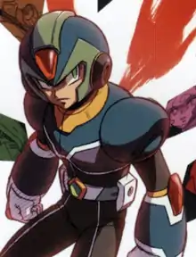 Inafune and Kaji worked simultaneously on various designs for X with different pieces of armor attached. The idea for the armor parts came about because the game was planned during a time when role-playing video games were becoming extremely popular. Inafune felt that Mega Man had always represented a classic action game formula where the hero earns his defeated enemies' abilities; the armor parts were added to supplement this concept.[5] Inafune created the character Zero, whom he originally intended to be the game's main, playable protagonist.[5] "When the X series came out, I really wanted to redesign Mega Man," Inafune explained. "I wanted a totally different Mega Man. I’m a designer, a creator; I wanted something new. I didn’t want to use the same old Mega Man."[6] Fearing a negative reaction from fans, Zero was ultimately reduced to a role secondary to Mega Man X.[6][7] Inafune noted that in early sketches, X and Zero were too similar, so Capcom aimed to make their silhouettes contrast one another due to make the merchandise easier to distinguish.[8] Early illustrations of X made him look like a "cold-blooded killer", which led artists to soften his features in later games.[9]