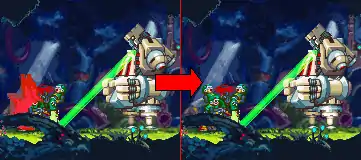 The robot at the beginning of Mega Man Zero firing at resistance fighters, causing them to spurt blood in the Japanese version (left); other instances of blood would often be edited out of international releases (right) of each game.