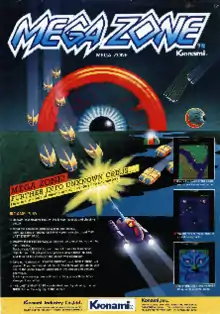 Mega Zone is an overhead vertically scrolling shooter game released in arcades by Konami in 1983. Mega Zone is similar to Xevious, but with points where the player can choose either the left or right fork of a branching path.[4]