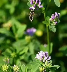 Megachile rotundata, the alfalfa leafcutting bee,[1] is a European bee that has been introduced to various regions around the world. As a solitary bee species, it does not build colonies or store honey, but is a very efficient pollinator of alfalfa, carrots, other vegetables, and some fruits. Because of this, farmers often use M. rotundata as a pollination aid by distributing M. rotundata prepupae around their crops.[2] Each female constructs and provisions her own nest, which is built in old trees or log tunnels.[3] Being a leafcutter bee, these nests are lined with cut leaves.[4] These bees feed on pollen and nectar and display sexual dimorphism. This species has been known to bite and sting, but it poses no overall danger unless it is threatened or harmed, and its sting has been described as half as painful as a honey bee's.[5]