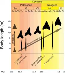 Another model of the evolution of this genus, also proposed by Casier in 1960, is that the direct ancestor of the Carcharocles is the shark Otodus obliquus, which lived from the Paleocene through the Miocene epochs, 60 to 13 Mya.[30][32] The genus Otodus is ultimately derived from Cretolamna, a shark from the Cretaceous period.[6][34] In this model, O. obliquus evolved into O. aksuaticus, which evolved into C. auriculatus, and then into C. angustidens, and then into C. chubutensis, and then finally into C. megalodon.