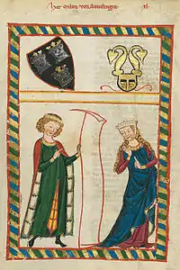 The final two strophes in C are generally ascribed not to Meinloh but to Reinmar von Hagenau, since the first of them (Swem von guoten wîben liep geschiht) is duplicated later in the manuscript (folio 107r) under Reinmar's name.[4]