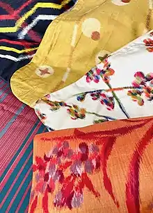 Meisen (銘仙, lit. 'common silk stuff') is a type of silk fabric traditionally produced in Japan; it is durable, hard-faced, and somewhat stiff, with a slight sheen,[1]: 79 and slubbiness is deliberately emphasised.[2] Meisen was first produced in the 1880s,[3] and became widely popular during the 1920s and 30s (late-Taishō to early-Shōwa period), when it was mass-produced[2] and ready-to-wear kimono began to be sold in Japan.[4] Meisen is commonly dyed using kasuri (Japanese ikat) techniques, and features what were then overtly modern, non-traditional designs[5] and colours.[2] Meisen remained popular through to the 1950s.[2]