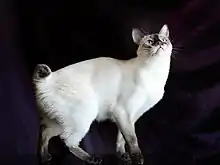 Mekong Bobtails have a glossy, short coat that can be any pointed colour without white markings, and large eyes which the WCF's breed standard terms an "intense blue".[7] The characteristic bobbed, kinked tail contains at least three vertebrae, but must be shorter than a quarter of the body length.[7][3] The breed has a slight although rectangular build, and the rump is higher than the shoulders.[7] Mekong Bobtails are medium-sized cats, weighing from 8 to 10 pounds (3.6 to 4.5 kg).[5] They have a life expectancy of 15–18 years.[8]